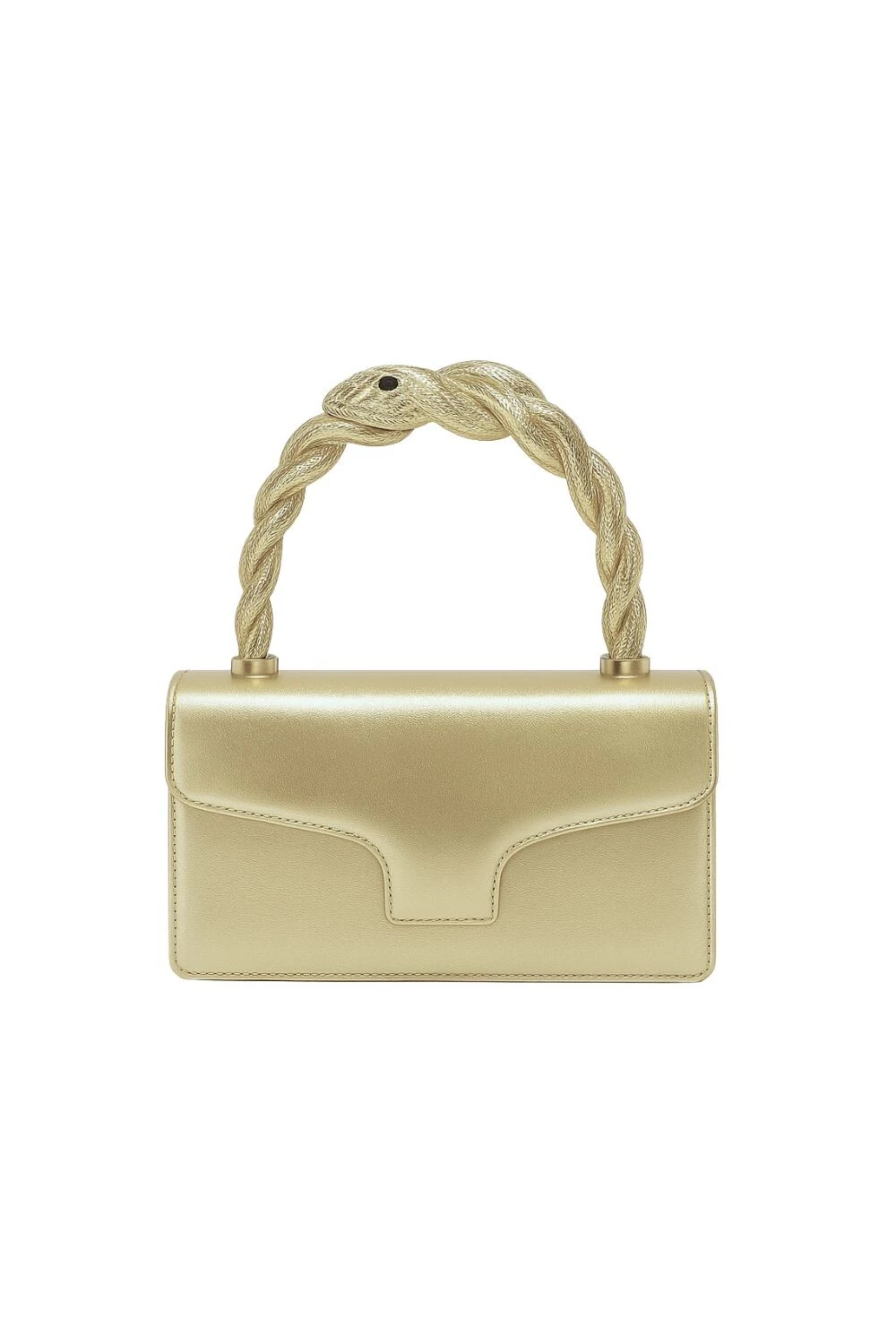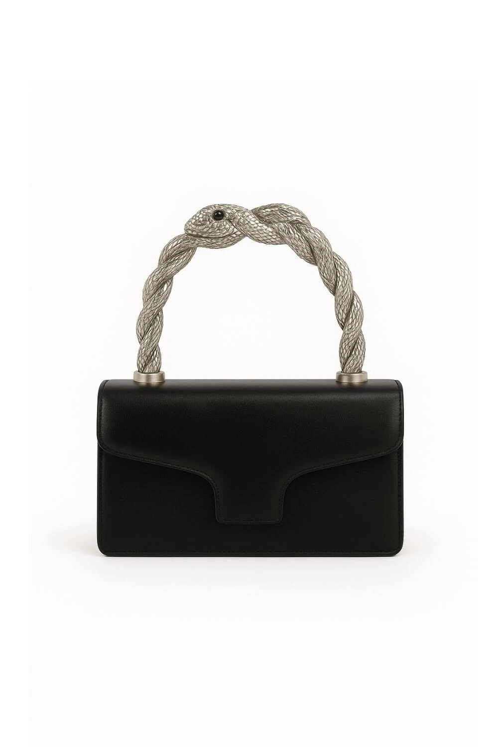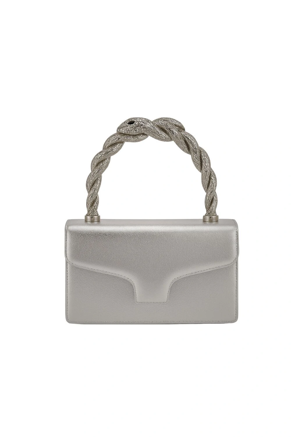 Seu design elegante traz acabamento metalizado moderno e alça trançada em formato de cobra, garantindo um toque único e ousado à peça. Compacta e versátil, é perfeita para acompanhar produções noturnas ou ocasiões especiais, trazendo praticidade sem abrir mão da elegância.