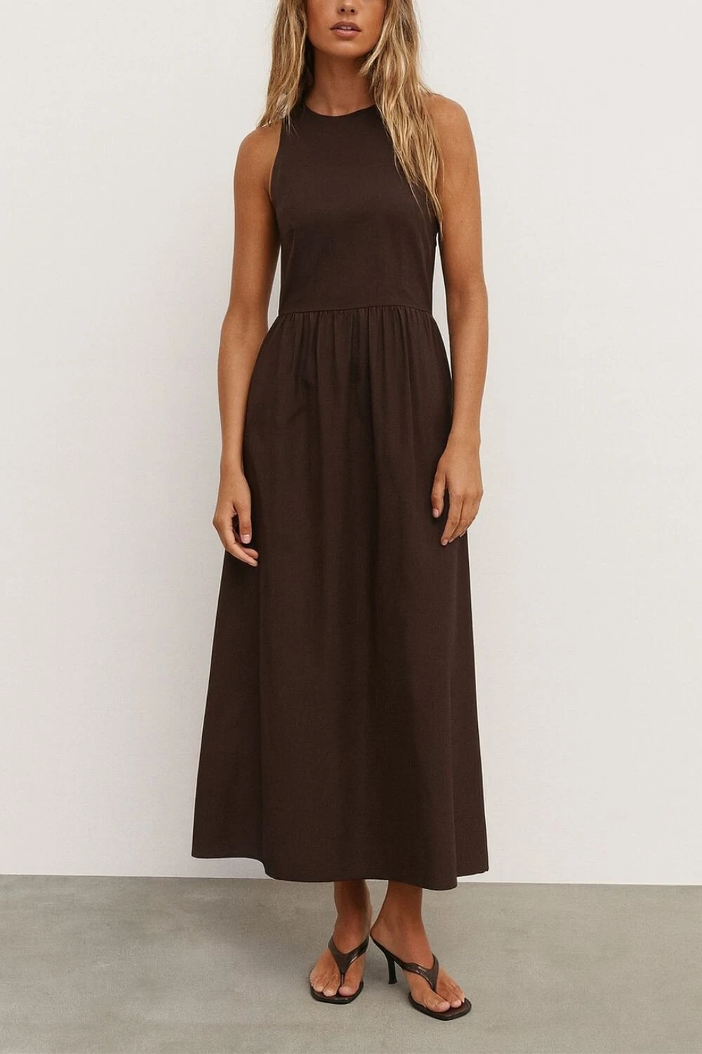 Vestido regata com modelagem reta e caimento leve. A cintura franzida traz movimento e delicadeza à peça, enquanto a saia garante um visual elegante e versátil.