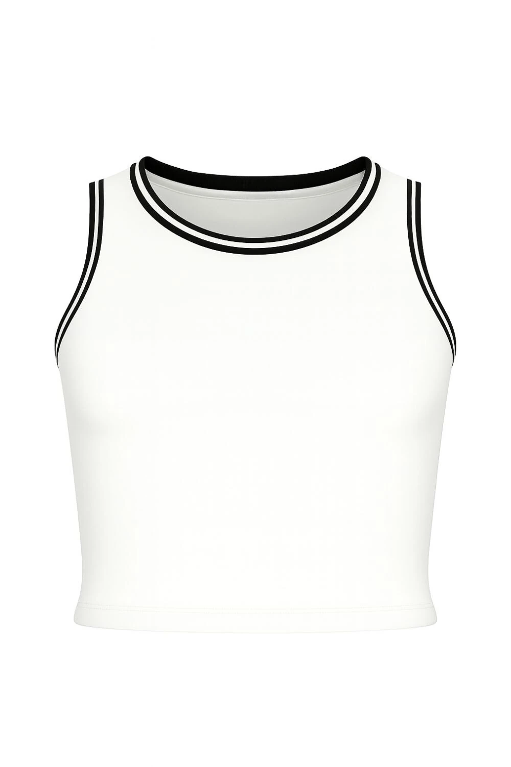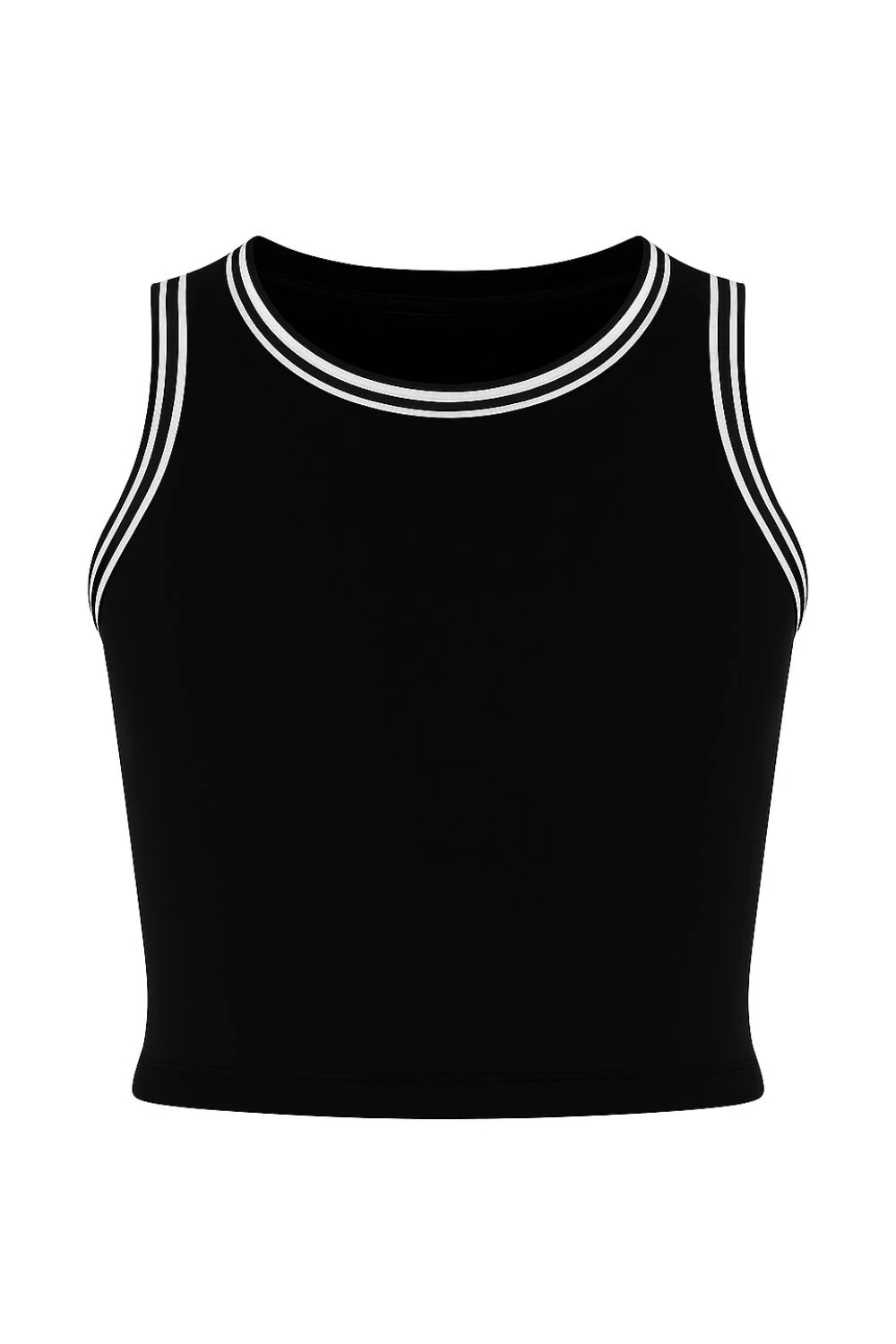 - Com viés preto contrastante na gola e cavas