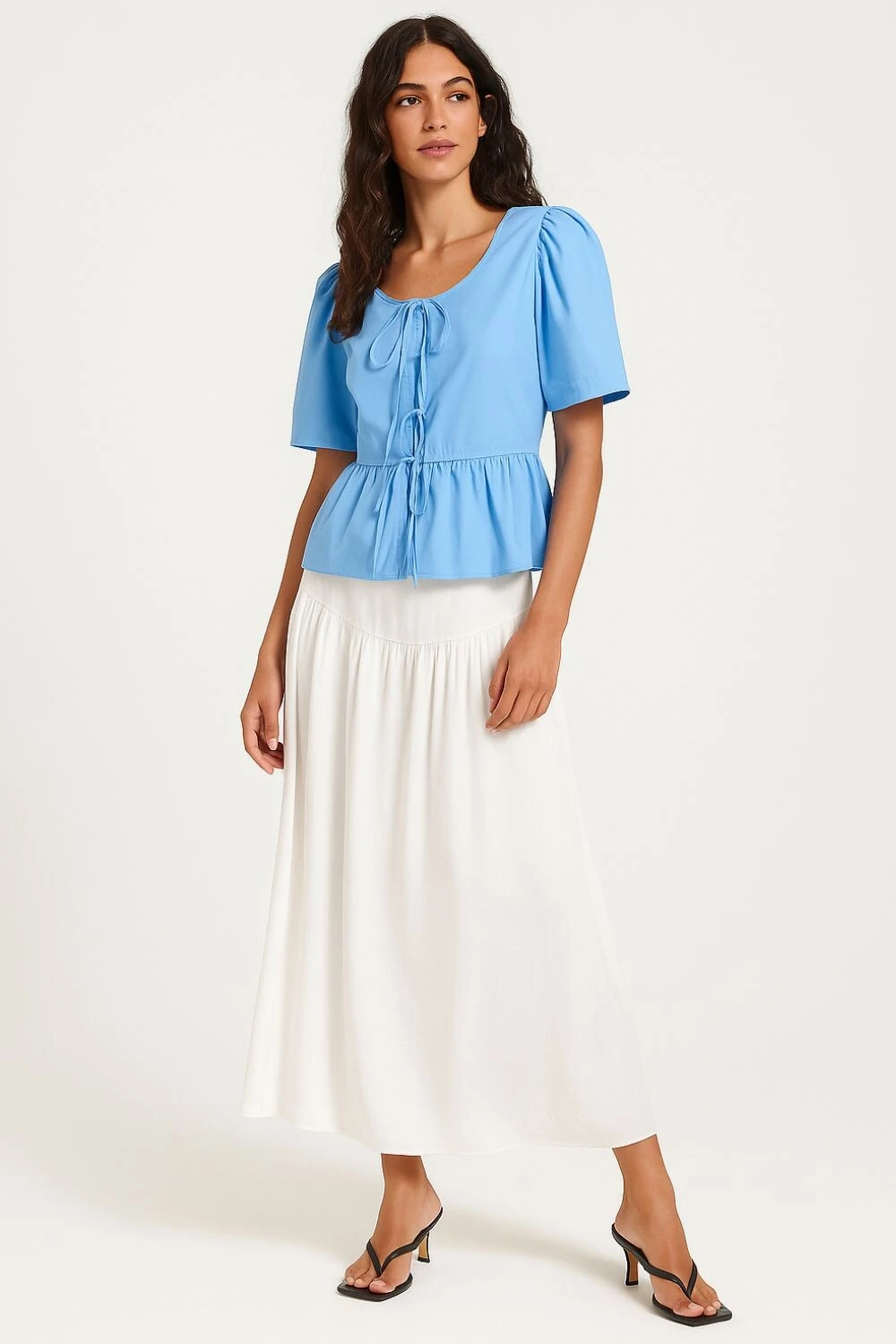 - Modelagem acinturada com babado na barra