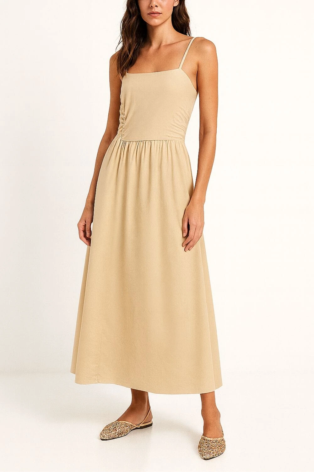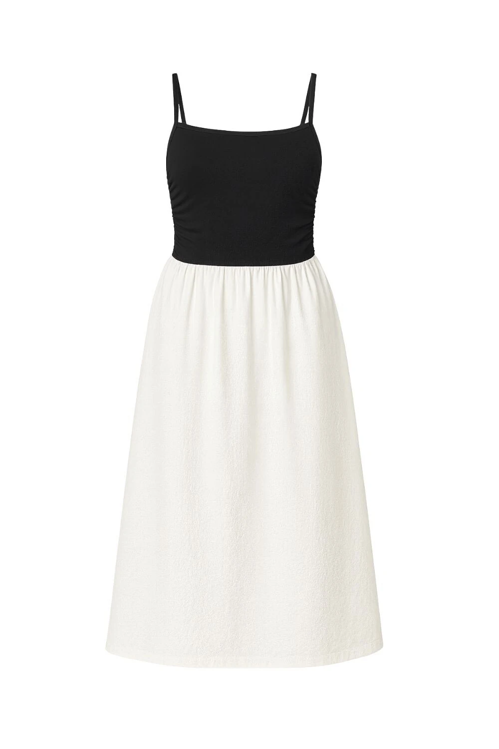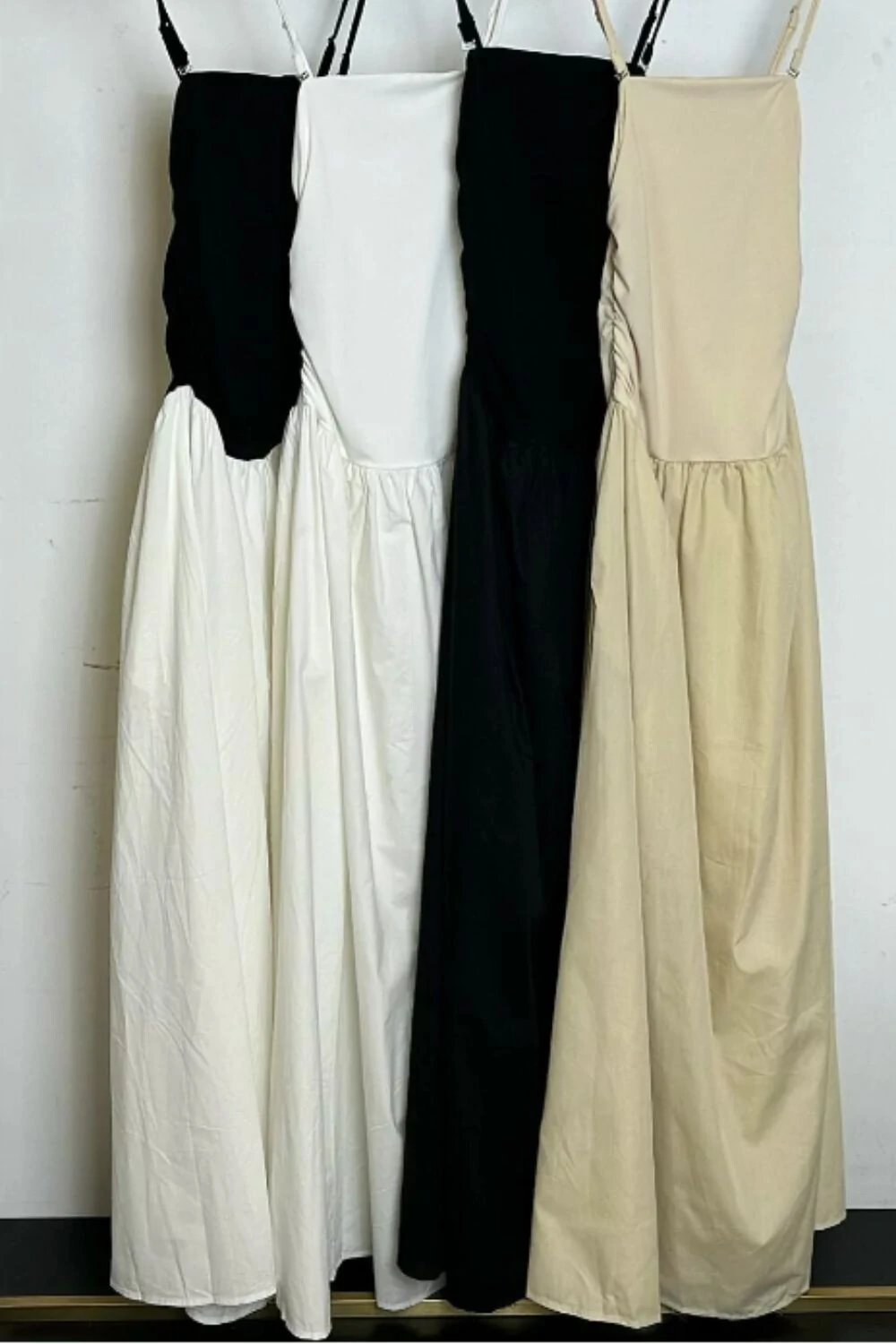 Vestido feminino midi confeccionado em combinação de malha e tricoline, unindo conforto e elegância. A parte superior, em malha leve e ajustável, valoriza o corpo com caimento natural, enquanto a saia em tricoline traz volume sutil e movimento fluido. O modelo possui alças finas e detalhe drapeado lateral que adiciona um toque moderno e delicado à peça.