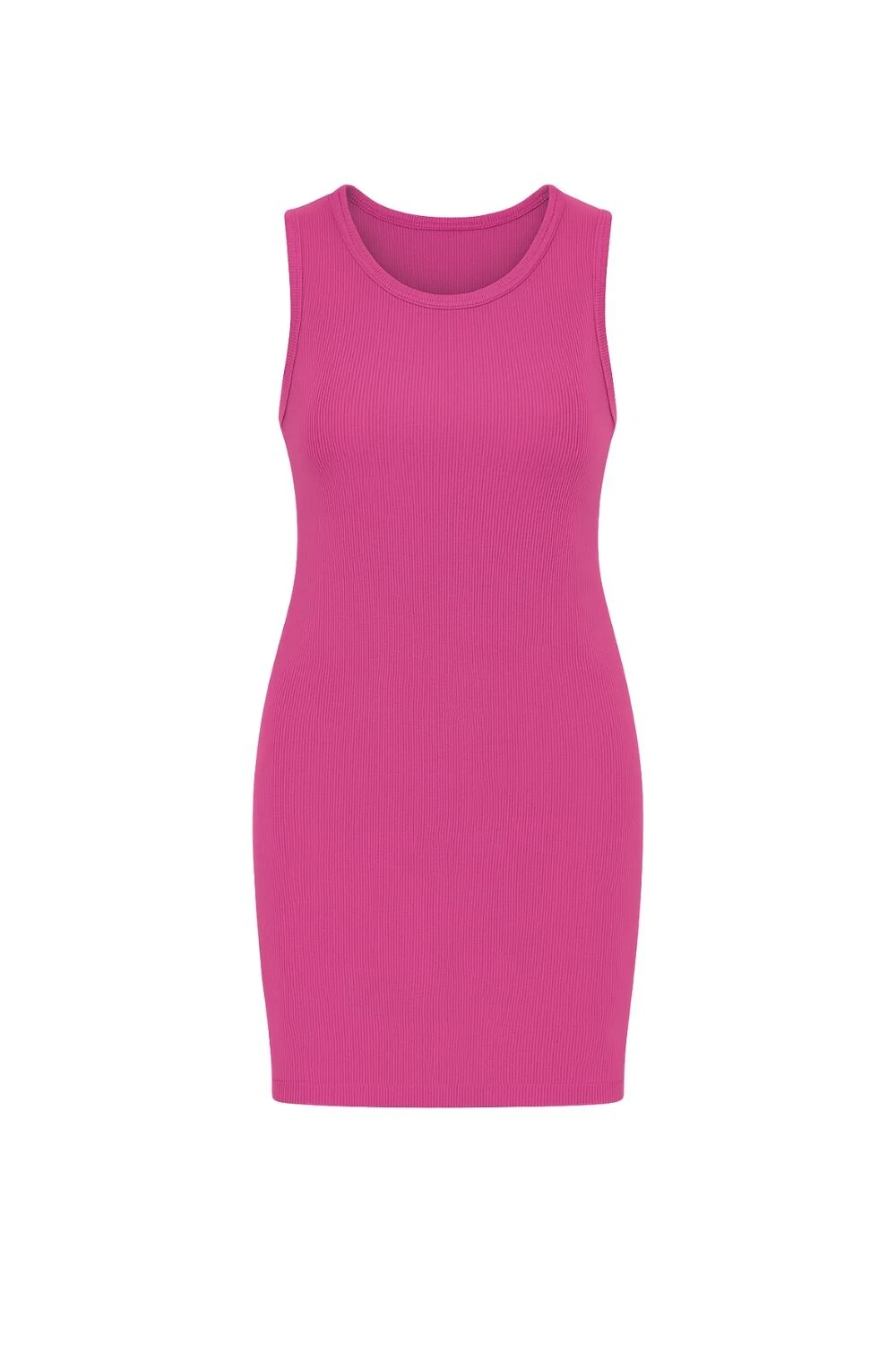 Vestido curto básico em malha canelada, com modelagem justa e caimento que valoriza a silhueta. Possui gola careca, cavas amplas e comprimento até o meio da coxa. Confeccionado em tecido elástico de textura canelada fina, oferece conforto, flexibilidade e toque macio ao vestir.