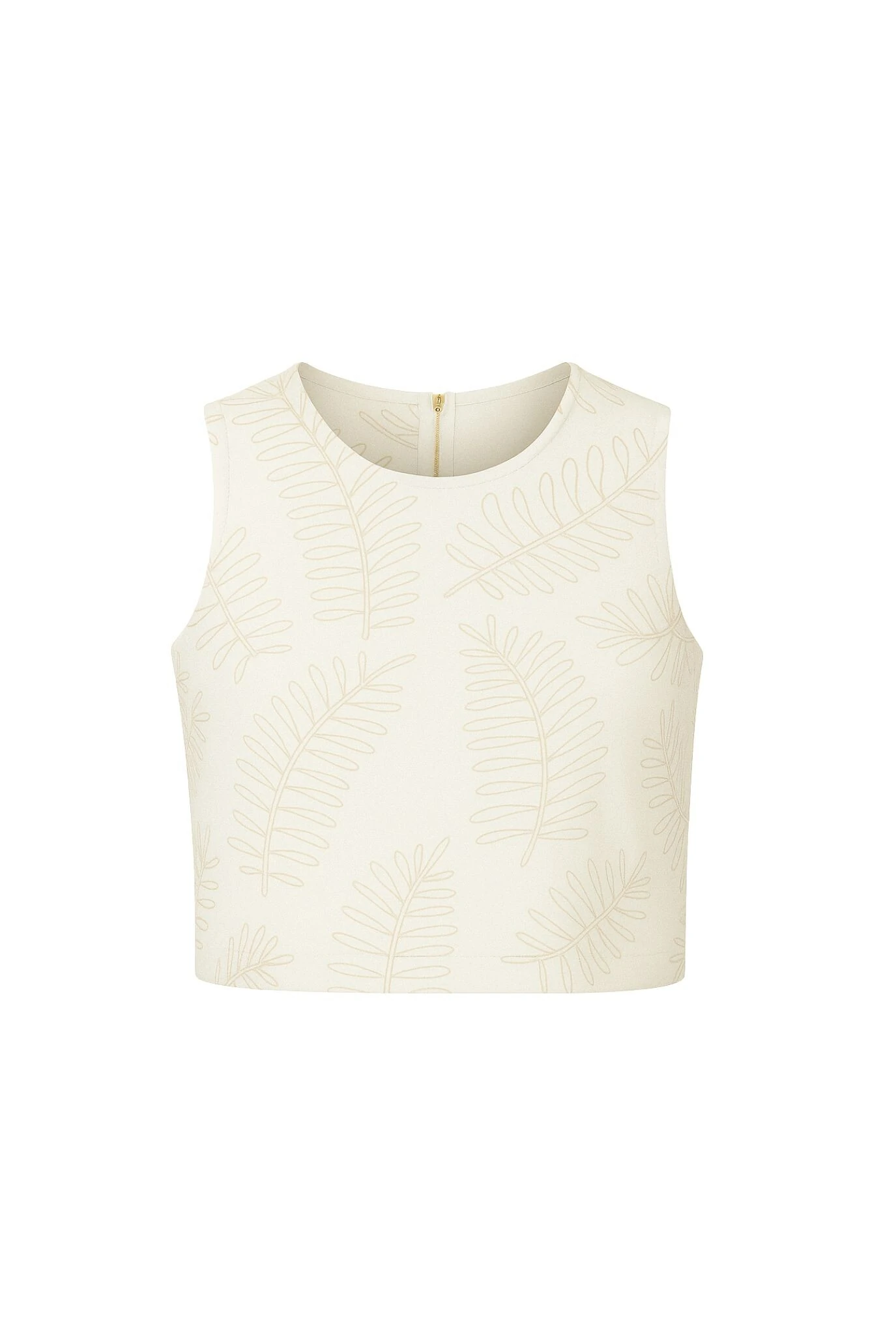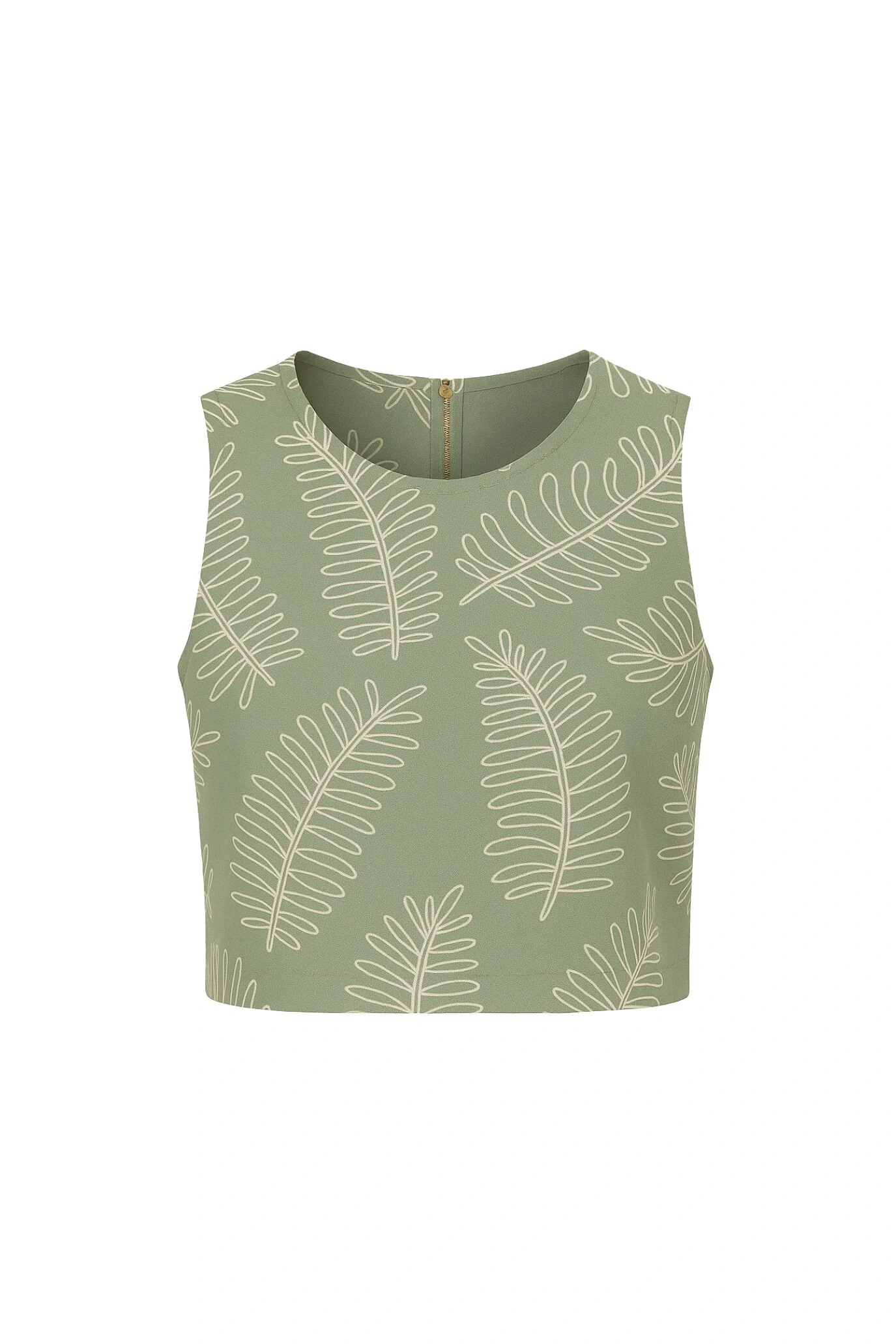 Cropped feminino com estampa de folhagens, confeccionado em tecido leve e estruturado. Possui modelagem reta que valoriza o tronco com caimento moderno e elegante. O decote redondo e o fechamento posterior por zíper metálico trazem praticidade e um toque sofisticado. Ideal para compor conjuntos coordenados ou looks independentes, garantindo estilo e conforto em qualquer ocasião.