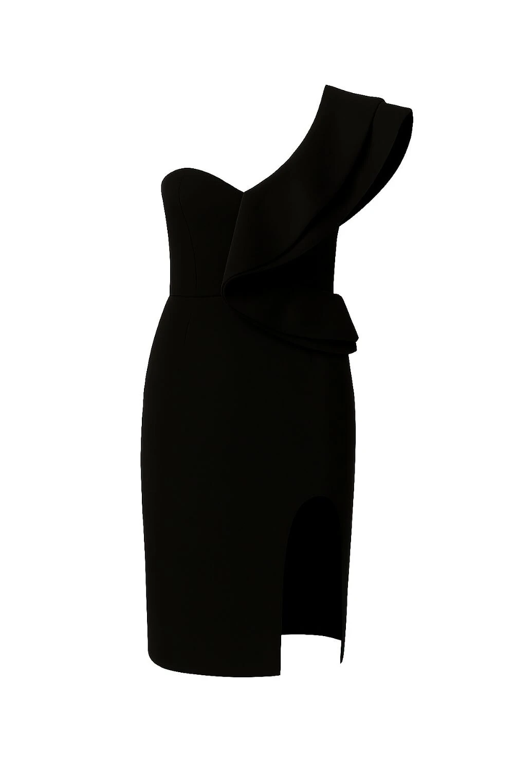 Vestido curto estruturado de modelagem moderna e elegante. Possui decote assimétrico com um ombro só e aplicação de babado volumoso que cria efeito escultural, valorizando a região do busto e dos ombros. A peça apresenta caimento ajustado ao corpo, com recorte que modela a silhueta sem perder o conforto. A fenda frontal arredondada adiciona um toque contemporâneo e sofisticado. Confeccionado em tecido encorpado com acabamento liso e impecável, perfeito para ocasiões especiais e eventos noturnos.