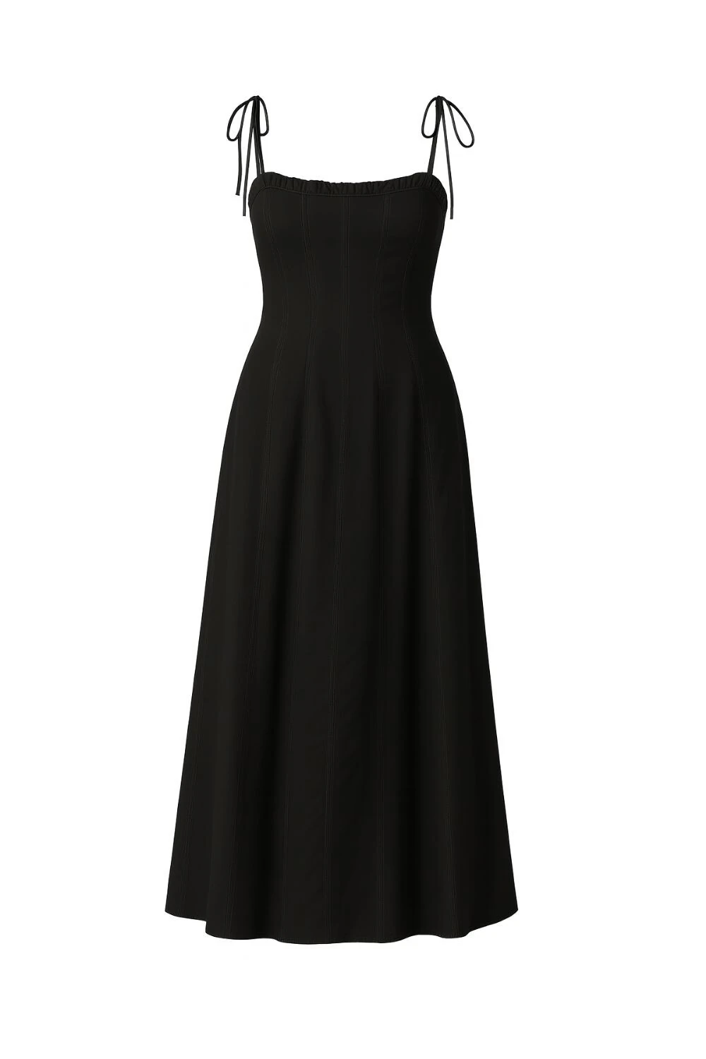 Vestido midi amarelo confeccionado em tecido com estrutura sutil que realça o caimento. A modelagem é ajustada na parte superior e levemente evasê na saia, valorizando a silhueta. Possui recortes verticais que alongam o corpo e detalhe franzido no decote reto com amarrações nos ombros, garantindo um toque delicado.