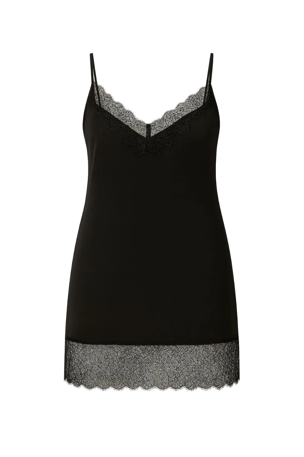 Vestido curto em tecido acetinado de caimento leve, com modelagem reta que valoriza a silhueta. Possui decote em V adornado com delicada renda preta e barra inferior rendada com acabamento em ondas. As alças finas e o brilho sutil do tecido conferem um toque elegante e feminino, ideal para composições sofisticadas e modernas.