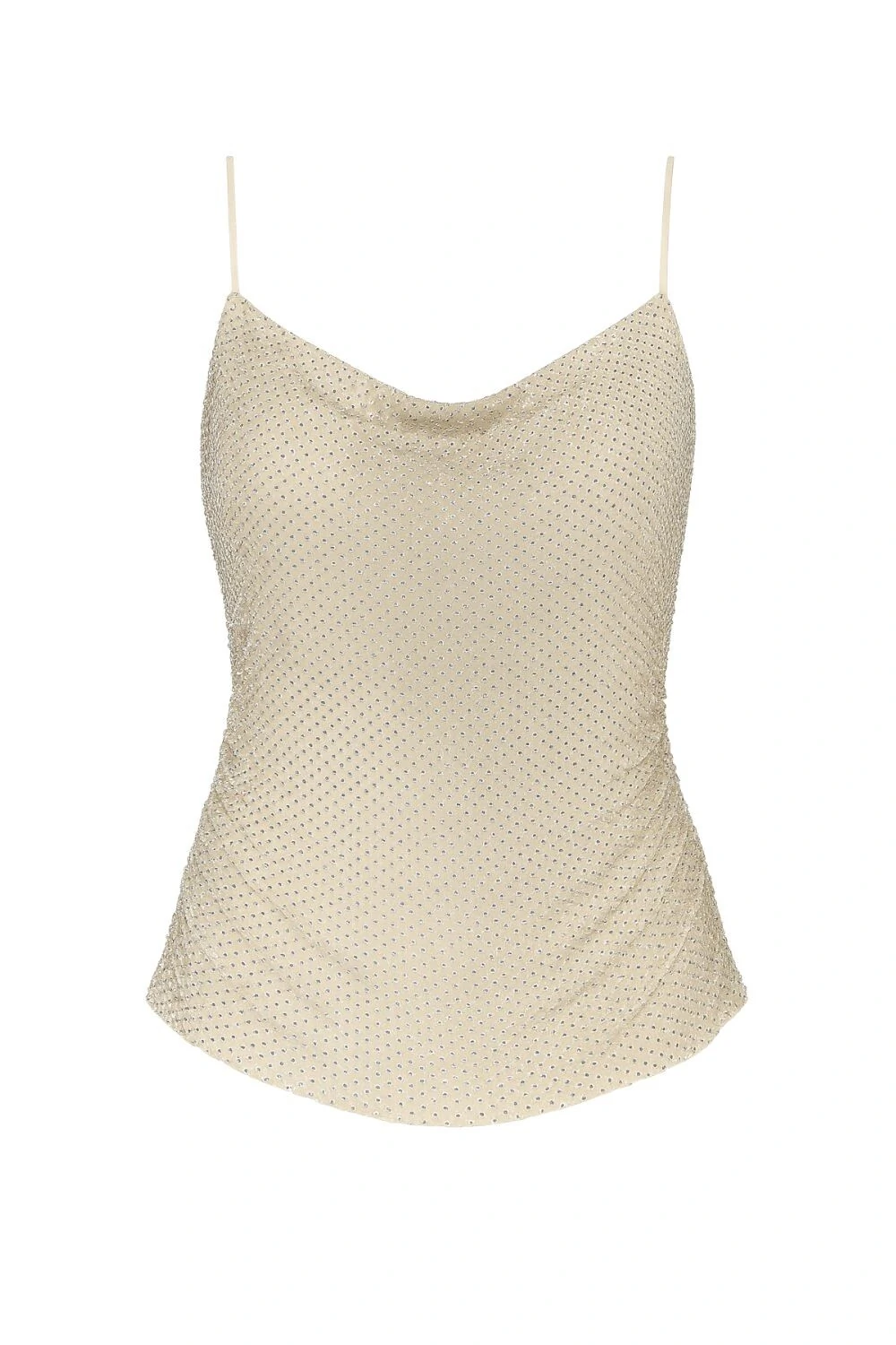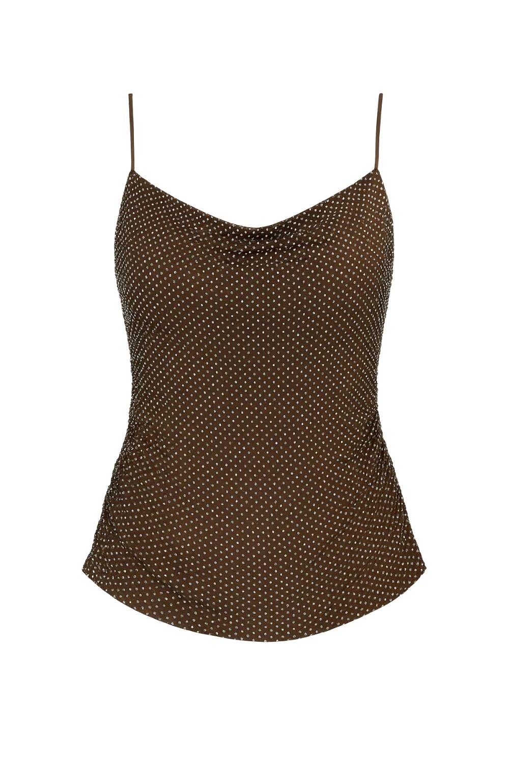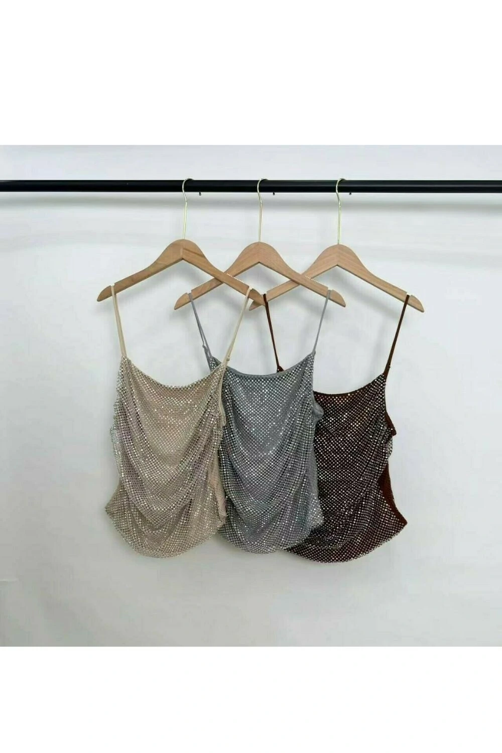 Blusa feminina confeccionada em tule telado com aplicação de micro pedrarias que criam um brilho elegante e sofisticado. O modelo possui alças finas e decote levemente drapeado, valorizando o colo com sutileza. Nas laterais da cintura, o leve efeito franzido adiciona um toque de movimento e realce à silhueta. A peça tem forro interno para garantir conforto e um caimento impecável. Ideal para compor looks modernos e refinados, seja em produções noturnas ou combinações festivas.
