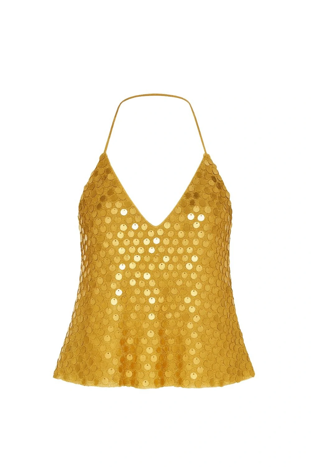 - Tecido coberto por paetês brilhantes e aplicados à mão