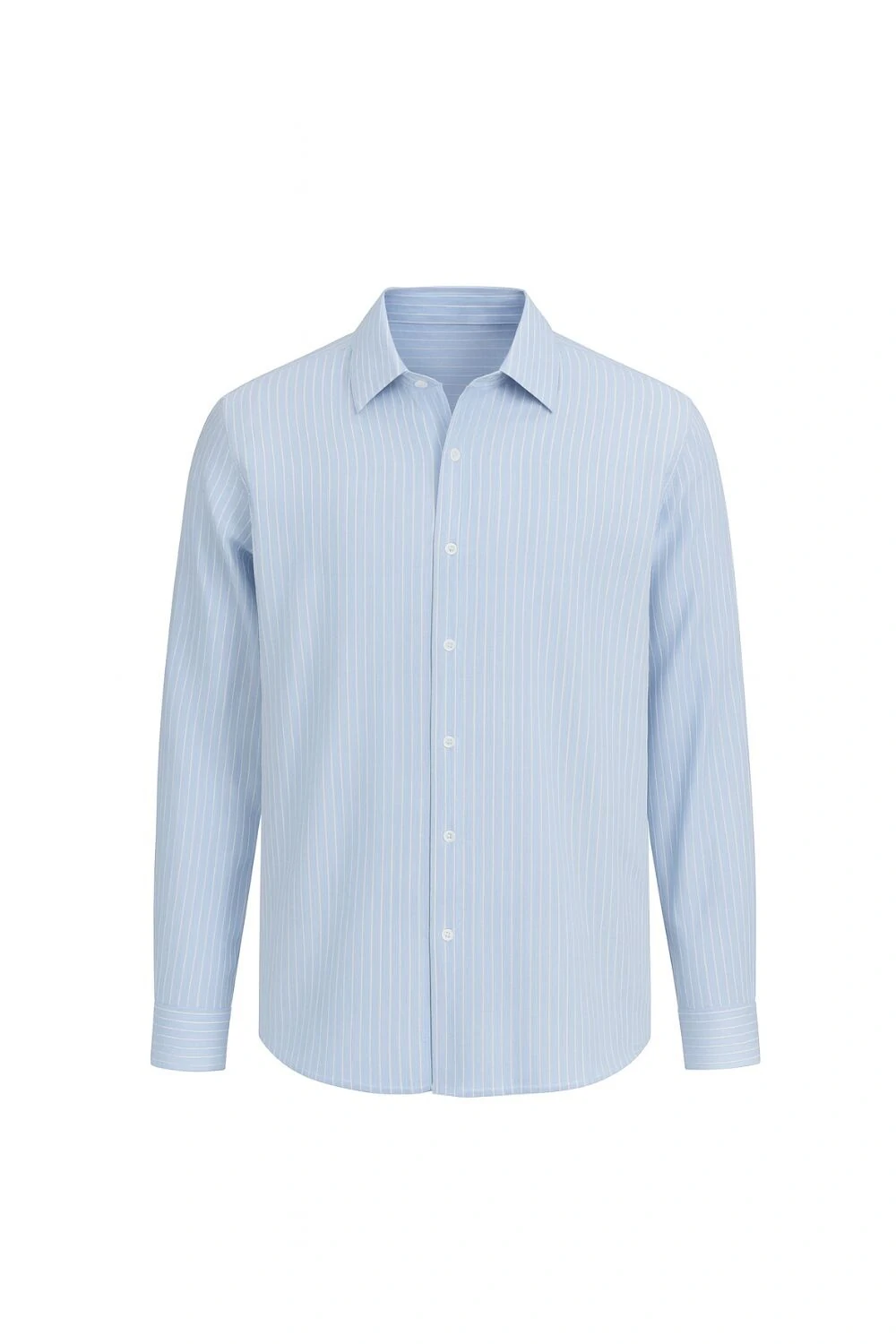 Camisa social masculina confeccionada em algodão leve, com design clássico e elegante. O tecido em azul claro com listras brancas finas e discretas traz um toque sofisticado e moderno, ideal tanto para o ambiente de trabalho quanto para ocasiões formais. Possui gola tradicional, abotoamento frontal e punhos ajustáveis, garantindo conforto e caimento impecável.