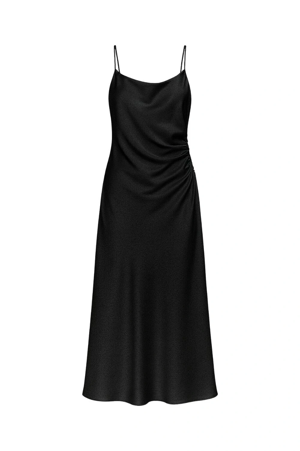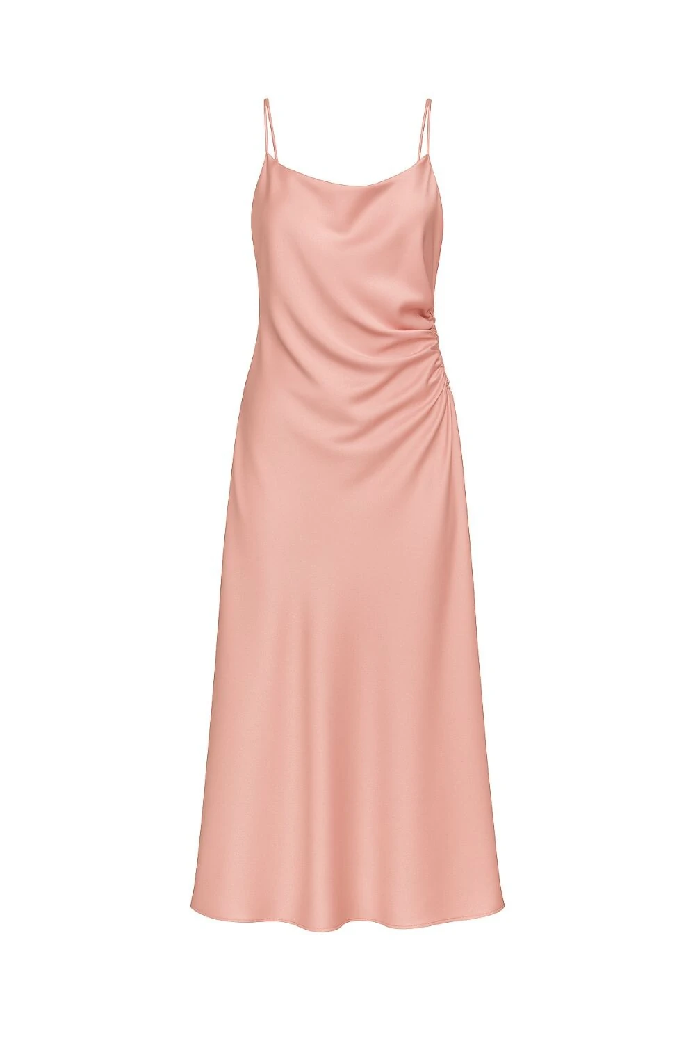 Vestido midi feminino confeccionado em tecido acetinado de caimento leve e toque sedoso. O modelo possui alças finas e detalhe drapeado lateral que valoriza a silhueta com elegância. O acabamento acetinado confere brilho sutil, tornando a peça ideal para ocasiões especiais e produções sofisticadas.