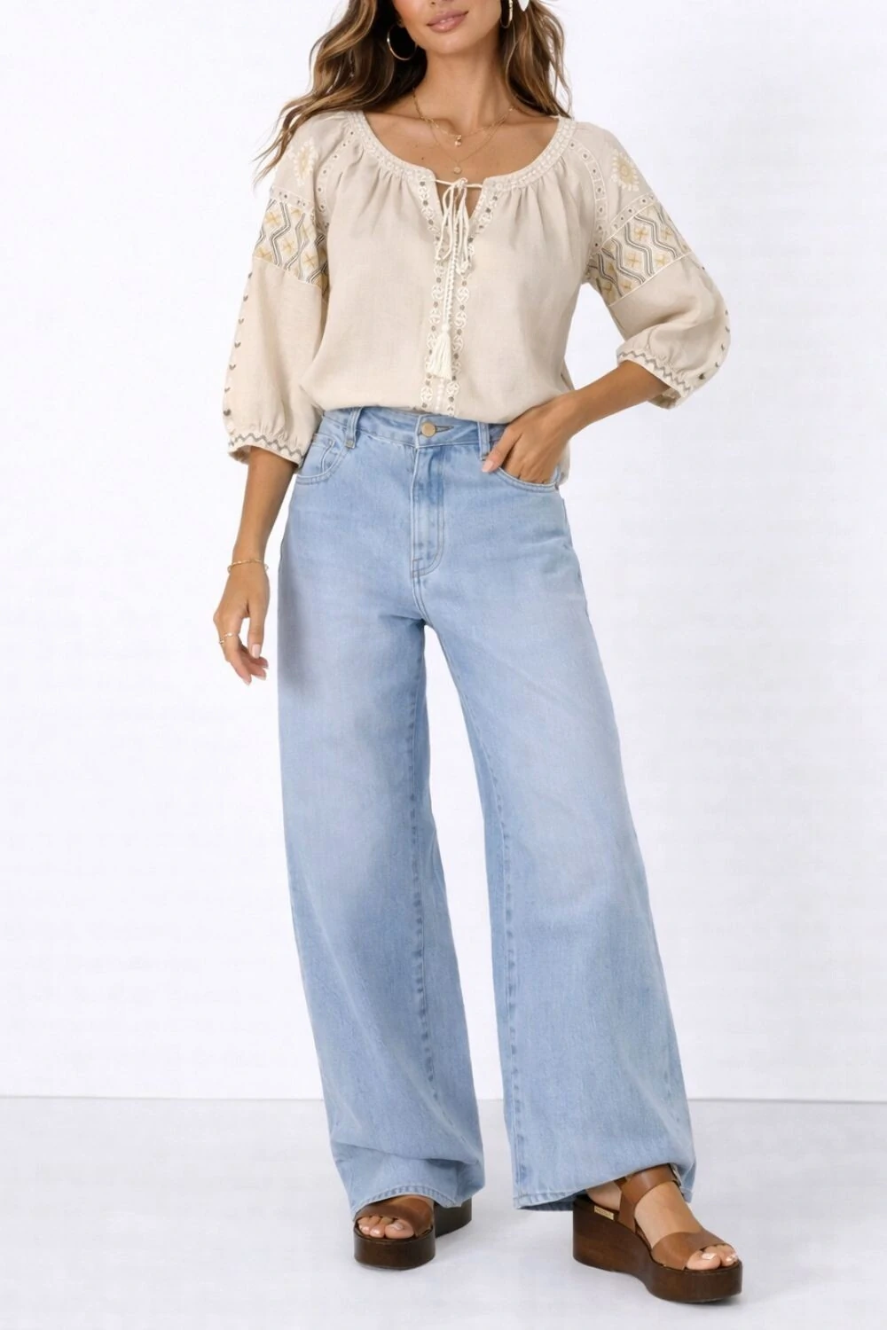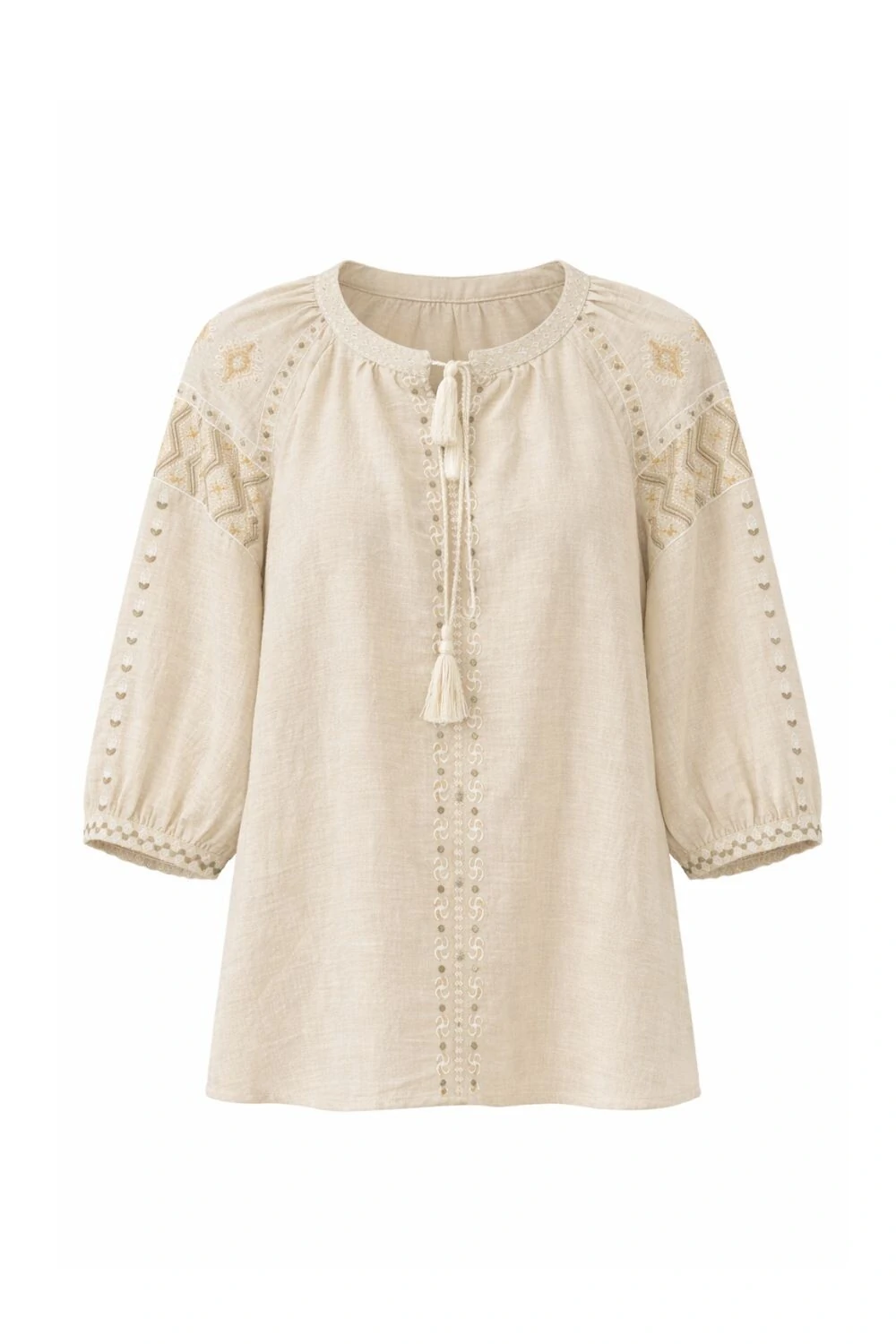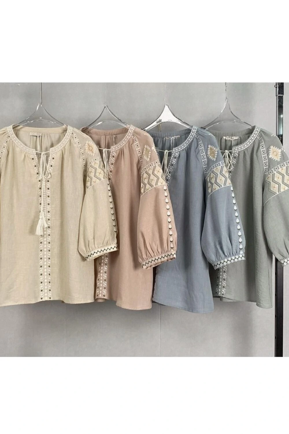 Blusa feminina confeccionada em Algodão, com toque leve e caimento confortável. Possui decote arredondado com amarração frontal e detalhes bordados que trazem um visual delicado e atemporal à peça. As mangas curtas com leve volume e acabamento bordado adicionam charme ao modelo, enquanto a modelagem soltinha garante liberdade de movimentos e bem-estar ao longo do dia.