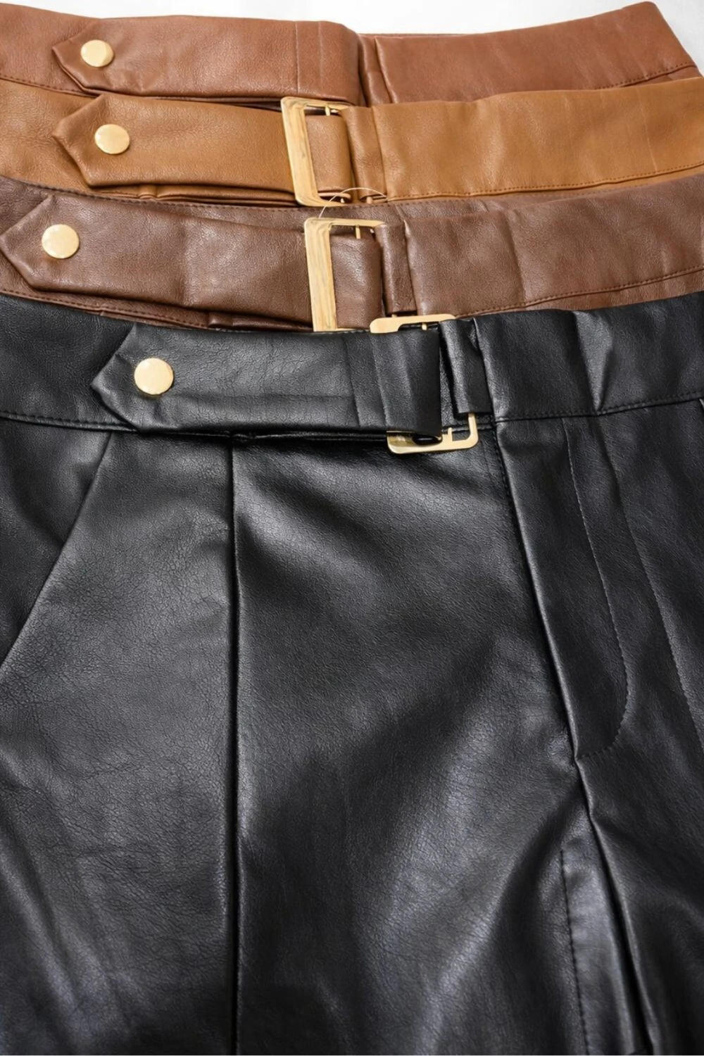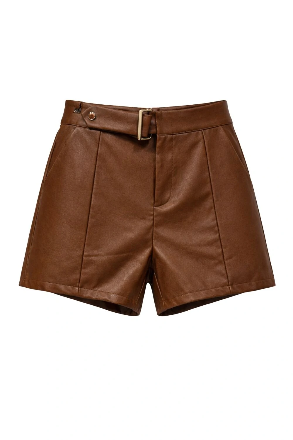 Short feminino em material sintético com aparência de couro, moderno e versátil. A peça possui modelagem reta com leve estrutura, pregas frontais que valorizam o caimento e cós com cinto do mesmo material e fivela metálica, trazendo um acabamento sofisticado ao look.