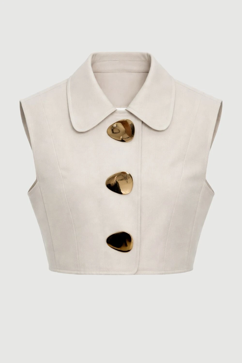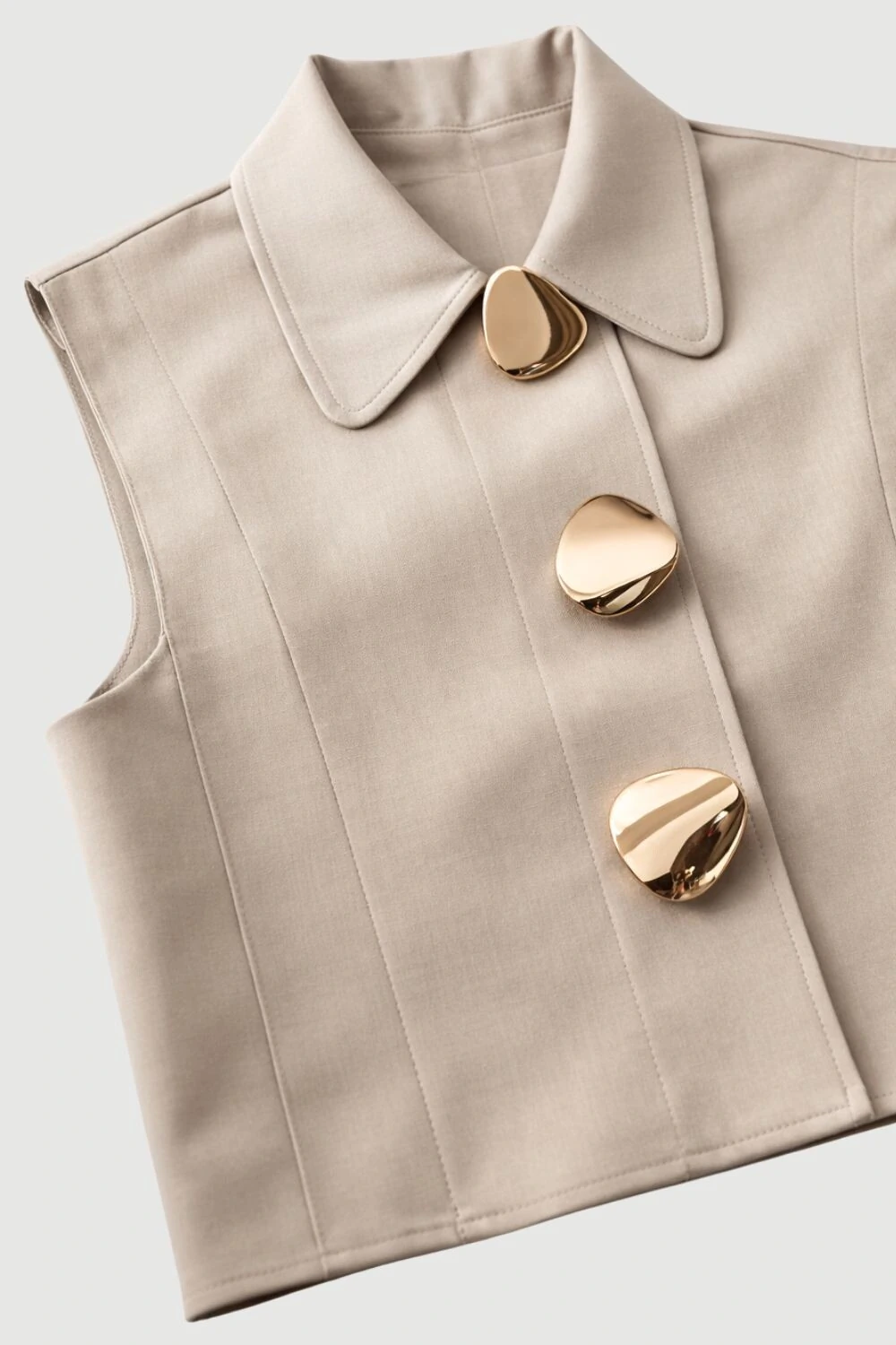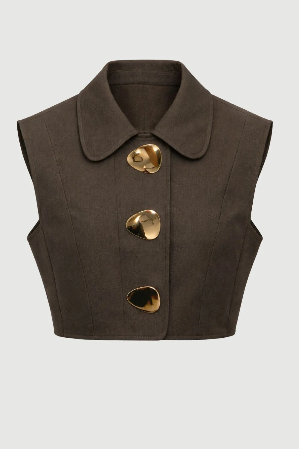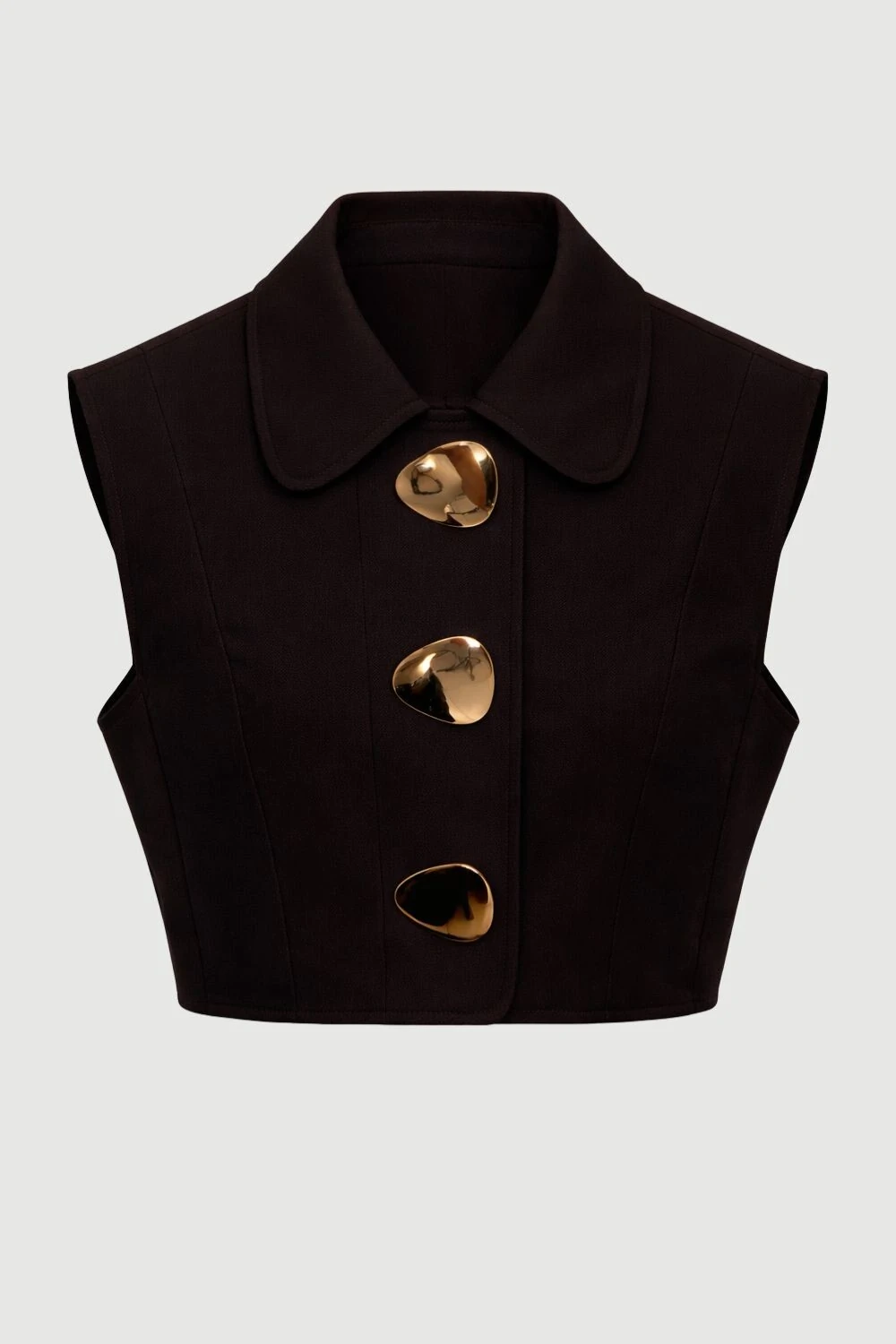 O colete cropped em alfaiataria é uma peça moderna e sofisticada, perfeita para composições elegantes. O grande destaque da peça está no fechamento frontal com broches metálicos de formato orgânico, que criam um visual artístico e sofisticado. Além disso, os broches são removíveis, permitindo diferentes formas de uso — desde uma proposta mais minimalista até um styling mais impactante.